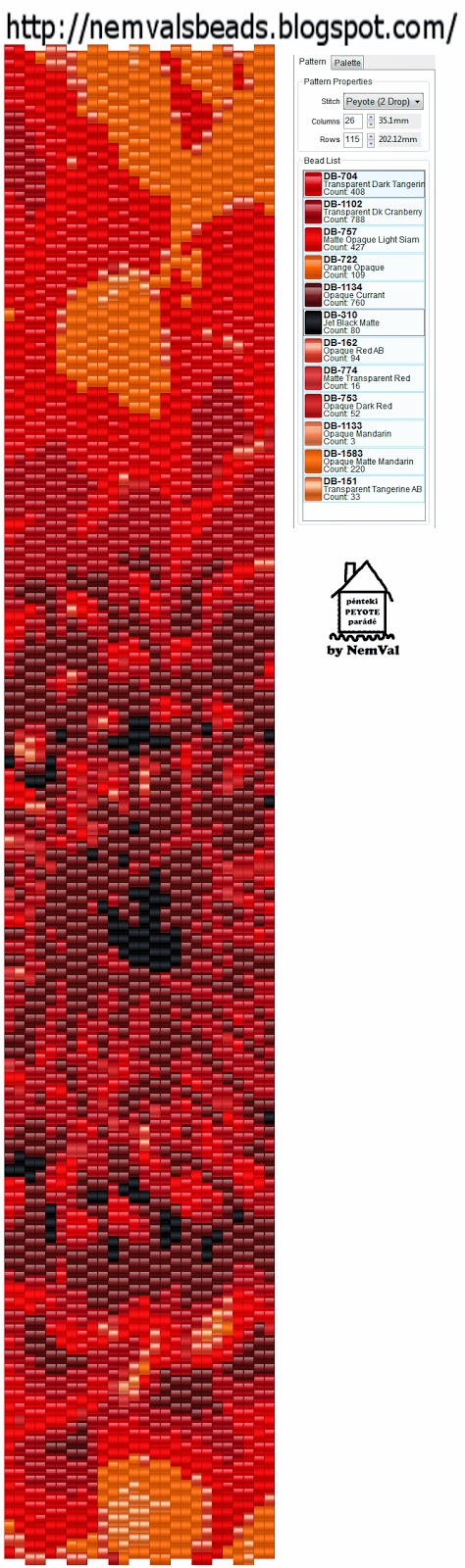 A rombuszok száma lehet akár páratlan is, mint itt, párosával a gyöngyök járnak ebben a kétszemes peyote mintában.